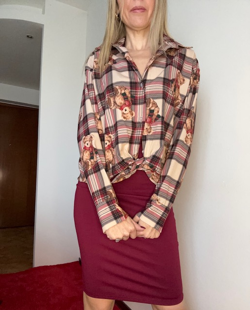 Camicia a quadri, con stampa orsetti, con colletto, bottoni e nodo sul davanti.