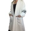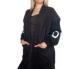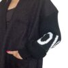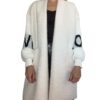 Cardigan lungo in maglia morbida, con maniche a contrasto e maxi scritta per un tocco contemporaneo. Linea comoda e avvolgente, perfetta per creare look casual chic o spezzare un outfit elegante con stile. Ideale da indossare aperto su top, camicie o dolcevita.