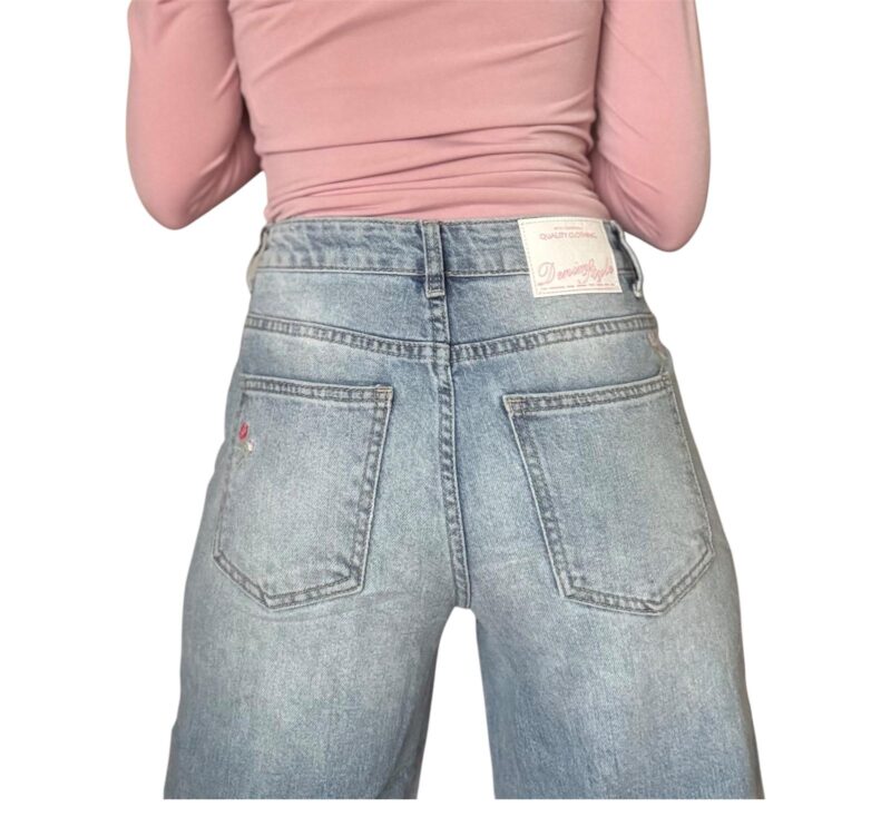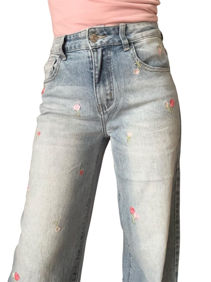 Jeans lavaggio chiaro, rose ricamate sulla parte davanti e sulle tasche dietro. 4 tasche. Bottone e cerniera per la chiusura. Passanti in vita.