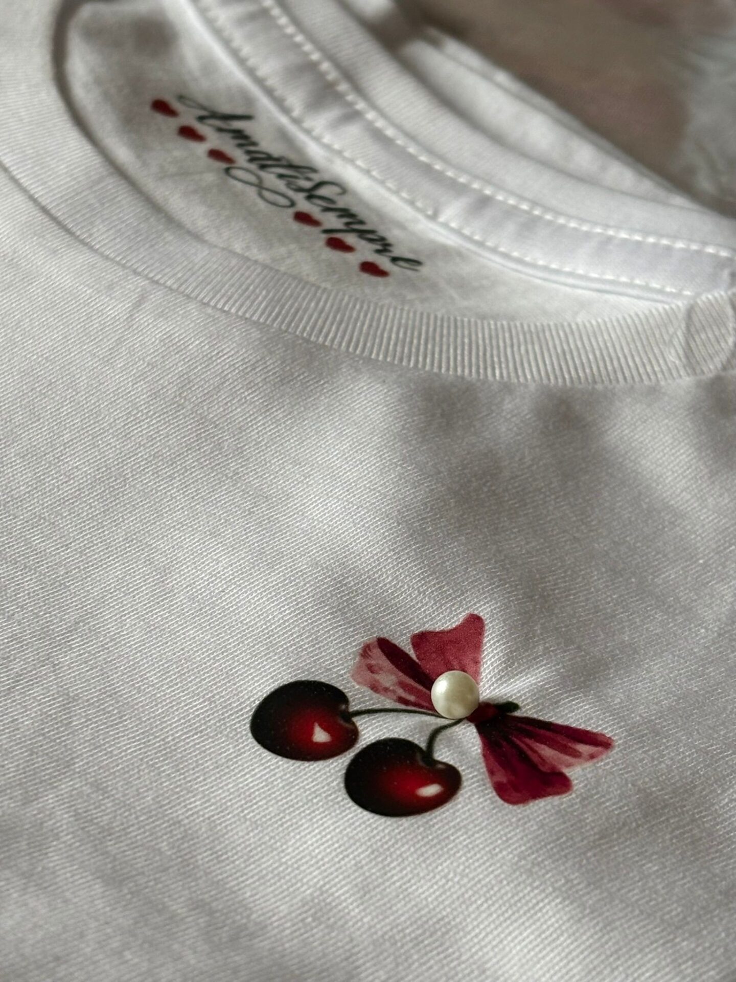 La t-shirt ciliegie è nata in una giornata no. Una di quelle in cui ti senti con il cuore un pò pesante. Mi sono fermata e mi sono chiesta: “Cosa mi farebbe bene adesso?” La risposta è arrivata subito. Il mare. L’estate. E da lì sono nate le ciliegie: dolcezza, stagione nuova. buonumore. Quando sono giù non scappo. Creo. Trasformo quello che sento in qualcosa che mi faccia stare meglio. La t-shirt ciliegie è un promemoria da indossare nei giorni no o per quando hai bisogno di un pò d’estate addosso, anche d’inverno.