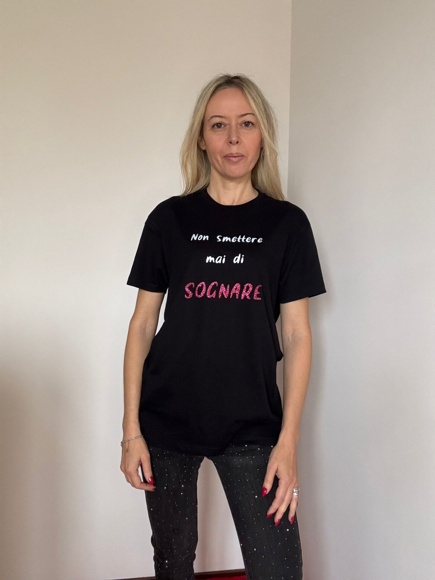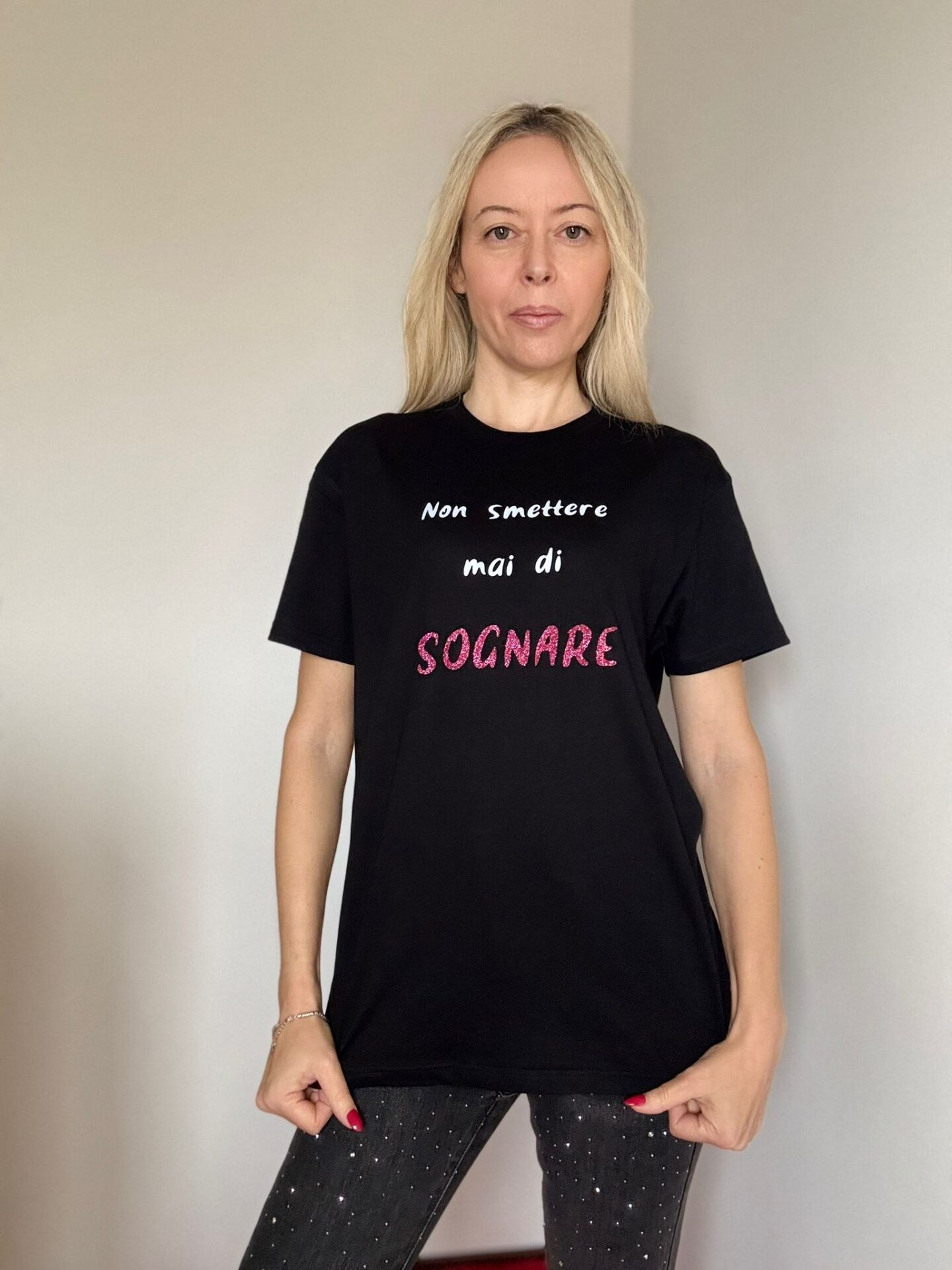 Volevo trascrivere le vostre emozioni sulle mie t-shirt, è così che è nata la t-shirt Katia. Ho chiesto alla mia community di Instagram di mandarmi le proprie emozioni, la frase che ho scelto tra tutte è appunto questa: “non smettere mai di sognare”. La t-shirt prende il nome dalla persona che mi ha inviato la frase e che poi ho scelto e lei ha ricevuto la t-shirt in regalo. Ti aspetto su Instagram @amatisempre_modamotivazionale.