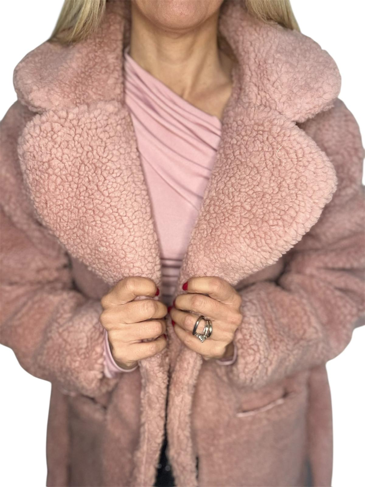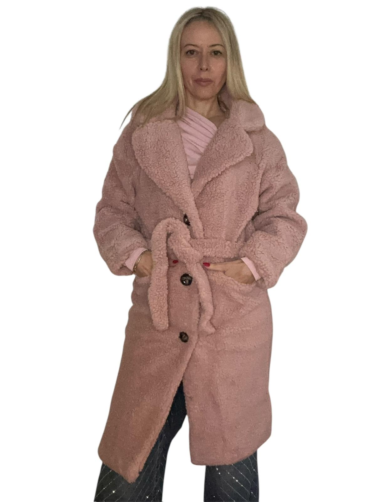 Cappotto Teddy con cintura e bottoni. Morbido, caldo e super femminile, avvolge come un abbraccio e aggiunge un tocco di dolce eleganza ad ogni look. Ideale per affrontare l’inverno con stile e comfort.